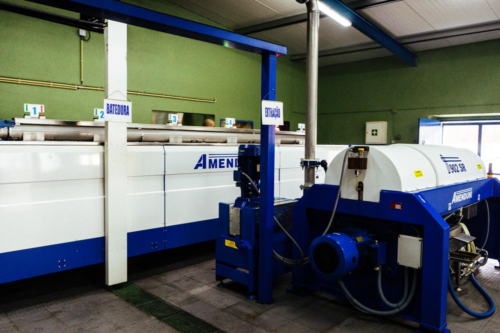 Seguidamente procede-se à sua lavagem para se iniciar o processo de produção – Moagem, batedura, extração, centrifugação e decantação.